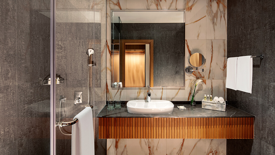 تتميز الغرف الفندقية في بزنس باي بتصميمات داخلية تنبض بالحياة، وتقدم مساحة مثالية للعمل والاسترخاء. ستغمرك غرفنا الفندقية الفاخرة في الخليج التجاري بأجوائها الدافئة وتجهيزاتها العملية، بما في ذلك اتصال الإنترنت عالي السرعة ونظام التحكم الذكي.