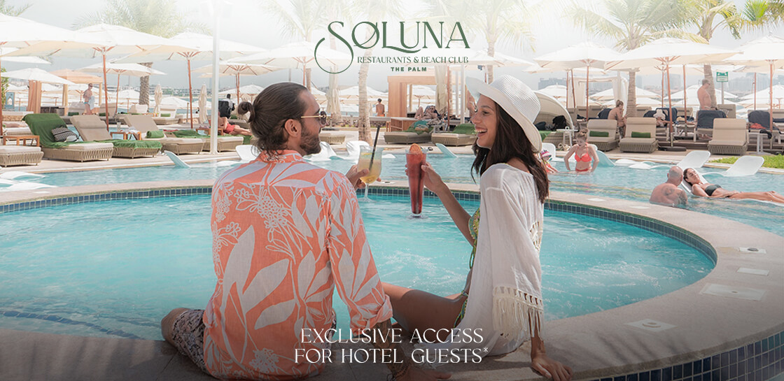 *Terms & conditions apply. Free transfers to Soluna Beach. Starting from rates are subject to Service Charge, Municipality Fees, VAT which will reflect upon booking confirmation. Tourism Dirham Fees to be paid during stay. Offer subject to availability. Blackout dates apply. Promotion is not valid in conjunction with any other promotion. Dining discount is not applicable on room service or tobacco. Pet policy applies. A non-refundable pet fee of AED 250 will be charged to your account on arrival. An additional cost of AED 75 per pet per night is applicable. Please contact the hotel prior to your arrival to know more about our policy.